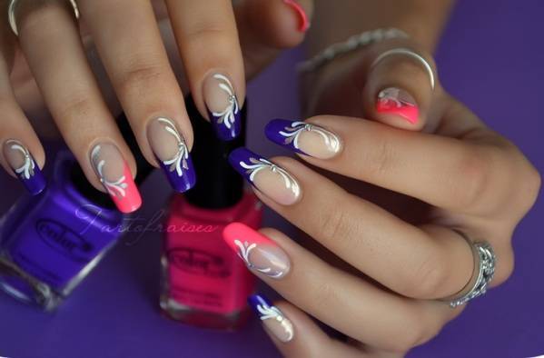 - Яркий френч. В этом случае вместо бежевых и белых тонов будет композиция из ярких красок.