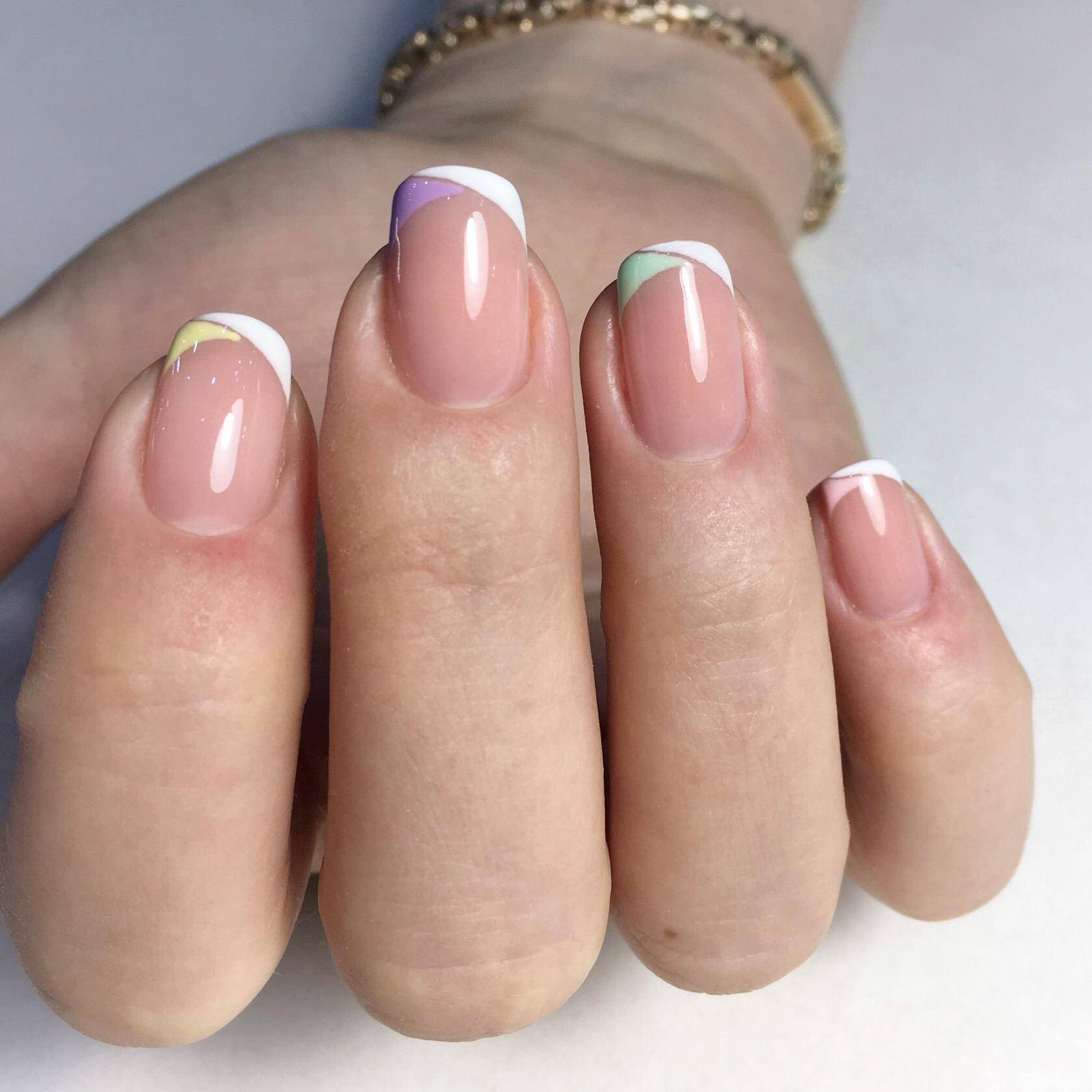 - Твист. Линия «улыбки» выполняется несколькими цветными линиями. Оригинально смотрится френч в виде радуги.