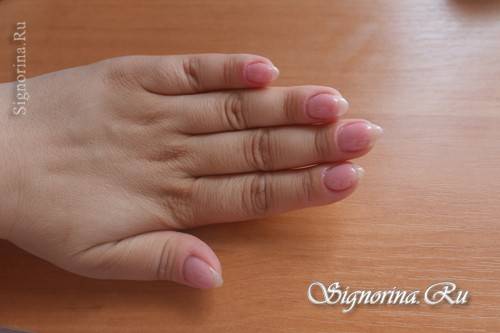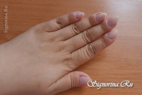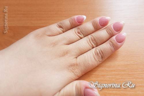 1) Если у вас уже были нарощенные гелевые ногти, то их нужно подготовить к коррекции: снять цветной гель-лак, удалить отслойки, обработать ногтевую пластину в зоне лунки, запилить синусы и придать ногтю желаемую форму. Если вы наращиваете ногти впервые, то вначале запиливается ногтевая пластина натурального ногтя, подготавливается к наращиванию, затем наращиваются ногти на формы, сушатся, и им придаётся желаемая форма. В начале выкладывания френча гелем рука выглядит примерно так.