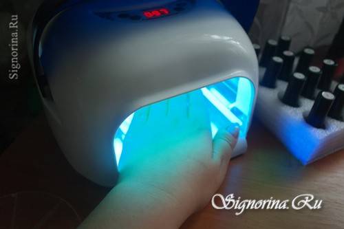 Нанесенный гель держат под УФ лампой несколько минут. После высыхания снимают форму, и обрабатывают неровности с помощью пилки. Сначала шлифуется зона боковых сторон, затем свободный край.