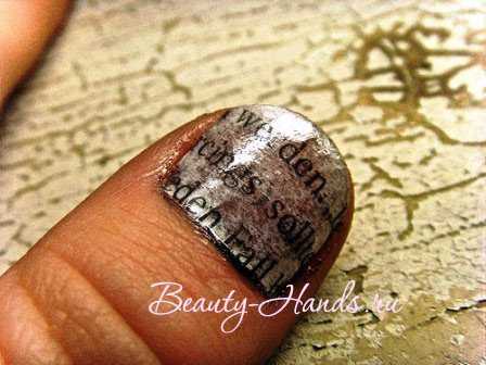 1. Из журнала или газеты вырежьте 10 кусочков с текстом. Затем покройте бесцветным лаком один ноготь, при этом ждать когда он полностью высохнет не требуется. Опустите кусочек газеты в спирт или жидкость для снятия лака (ненадолго), после чего достаньте его и прижмите к ногтевой пластине, но не двигайте, в противном случае типографская краска размажется.