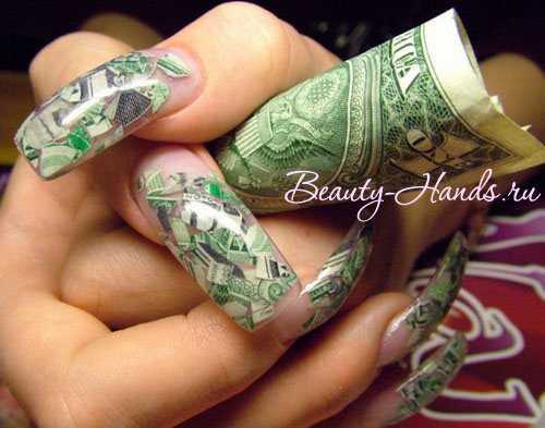 Кроме того, для оформления ногтей таким способом идеально подойдет не только газетный текст, но и другие интересные картинки. Например, очень изысканно смотрится «долларовый» маникюр (удовольствие, конечно, не из дешевых). А некоторые пошли еще дальше и стали использовать для оформления ногтей портреты кумиров, мировые карты и обожженные кусочки бумаги.