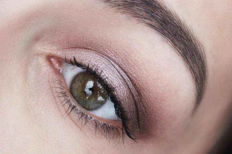 - На верхнее веко от ресниц до бровей нанести светло-перламутровые тени.