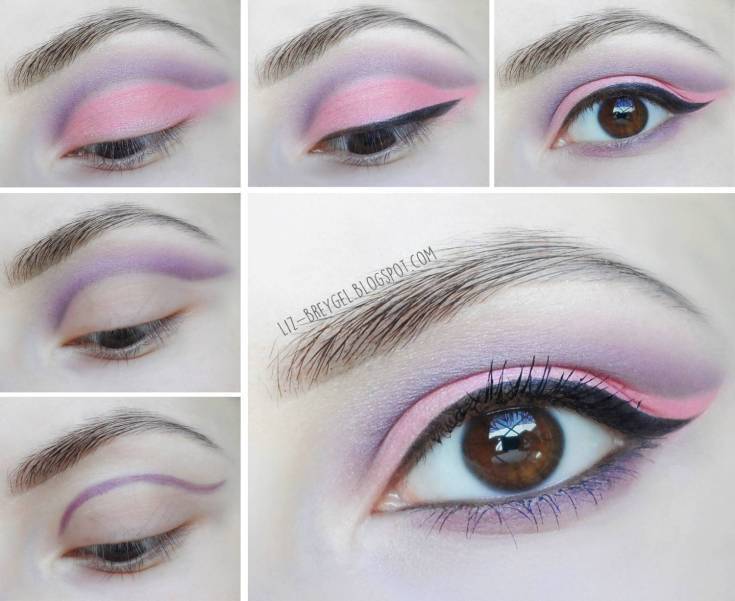 - хотите миндалевидные глаза – с помощью лайнера проведите линию нижнего века к наружному уголку брови, на верхнем веке тоже нарисуйте стрелку, «кошачий» взгляд вам обеспечен;