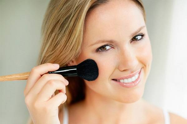 - Применение румян тоже носит ограниченный характер. Чаще их используют для вечернего варианта. При этом выбираются румяна неярких тонов, так, чтобы он гармонировал с натуральным цветом лица. Небольшое их количество наносится на скулы и растушевывается. Кроме того, подбирая соответствующие оттенки румян, можно подкорректировать черты лица.