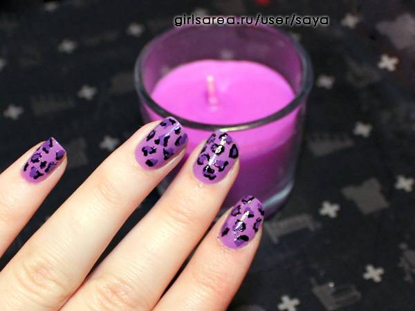 1) Леопардовый маникюр в фиолетовых тонах с мелким принтом. Использовались лаки: сиреневый, фиолетовый, черный; в качестве доттеров использовались скрепка (для пятен) и канцелярская булавка (для черный деталей). Больше фото этого маникюра здесь.