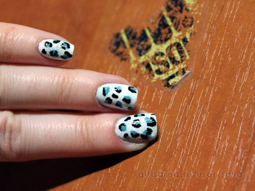 4) Бело-голубой леопардовый маникюр с мелкими пятнами и градиентом. Особенность в том, что перед леопардовым принтом здесь на белый фон наложен светло-голубой градиент. К сожалению, светло-голубой лак оказался настолько светлым, что на фото практически незаметен. Если на вашем экране все же видны бело-голубые переходы фона, то имейте в виду, что это за счет градиента (как его накладывать, описано здесь).