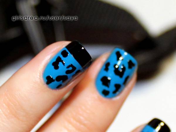 3) Синий леопардовый маникюр с одноцветными пятнами. Лаки: синий, черный. Пятна рисовались зубочисткой. Также использовался скотч для создания ровных черных кончиков. Больше фото здесь.