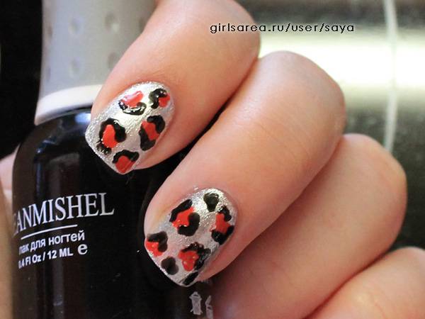 2) Черно-красно-серебряный леопардовый маникюр с крупными пятнами. Лаки: серебряный, красный, черный. В качестве доттеров использовались толстый стержень от шариковой ручки (для красных пятен) и подрезанная зубочистка (для черных деталей). Больше фото здесь.