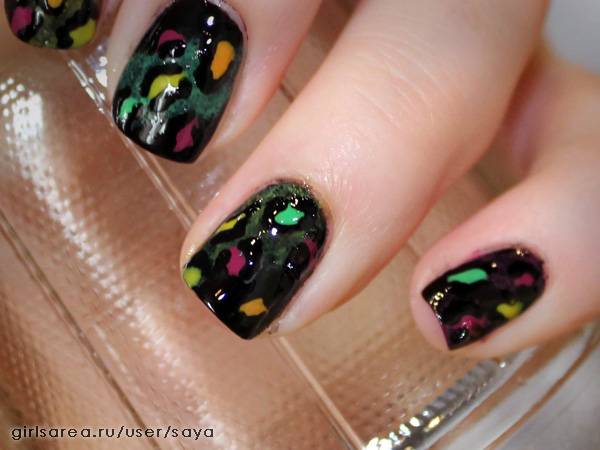 6) Темный маникюр с цветными пятнами на основе леопардового принта. Конечно, от леопарда тут осталось мало, но принцип создания маникюра такой же. Как и в варианте №4, на фоне сделан цветной градиент, который дает эффект перелива. Далее нанесены разноцветные пятна в леопардовой технике. При нанесении поверх прозрачного лака/закрепителя получается эффект муранского стекла.