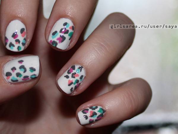 5) Цветной леопардовый маникюр на белом фоне с частичным нанесением принта. Особенности данного дизайна в том, что, во-первых, леопардовый принт размещается не на всей поверхности ногтей, а в заранее подобраннных областях; во-вторых, в смягчении общей цветовой гаммы маникюра за счет смешивания всех лаков с белым. Лаки смешивались перед нанесением, на палитре, в соотношении 1:1 (одна капля цветного или черного лака + одна капля белого), и размешивались зубочисткой. В результате получились неяркие пятна, обрамленные серым. Хотя при наличии в арсенале лаков приглушенного цвета можно обойтись и без хода со смешиванием.