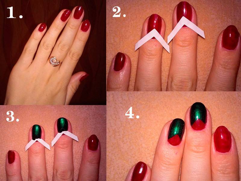 - Ту часть ногтя, которая не закрыта полосками закрасьте лаком другого цвета. Дайте просохнуть лаку. После этого удалите клейкую ленту.