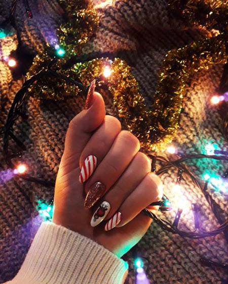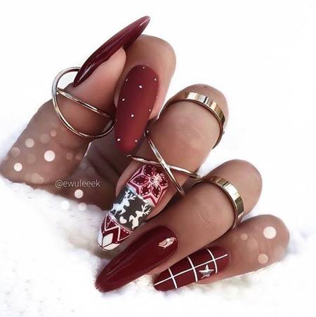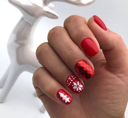 Красный, белый, золотой, серый, черный — идеальные зимние цвета для новогоднего маникюра сезона 2021. Кроме того, снежные хлопья, снежинки, морозные разводы, олени и т. д. также являются отличной идеей новогоднего дизайна ногтей.