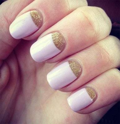 Еще одна вариация лунного маникюра, которая замечательно смотрится на коротких ногтях. В таком маникюре форма трафарета заменяется на более вытянутую. Белый лак наносится практически по всему краю ногтя. С таким маникюром пальцы и ногти зрительно становятся длиннее и тоньше. именно поэтому такой дизайн рекомендуют обладательницам коротких ногтей.