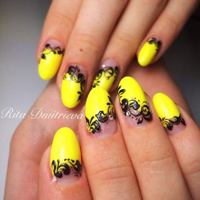Рисунки. Тут всё зависит от вашей фантазии. Например, на красной основе (в сочетании с зеленой лункой) нарисовать черные точечки. Получится свежий летний маникюр – арбузный.