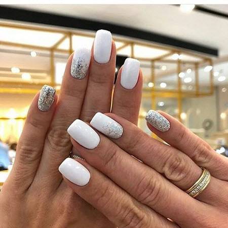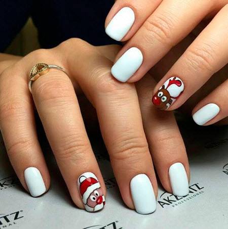 Белый цвет лака сочетается с многими оттенками лаков, этот цвет не выходит из моды, и с ним можно сделать множество разных вариантов новогоднего маникюра, добавив к нему рисунок, камушки и блестки.