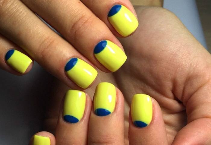 В целом это классический лунный маникюр, но с использованием ярких контрастных оттенков лака. Цветовая гамма может быть самая разная, причем вовсе не обязательно подбирать её к одежде. Такой маникюр вполне может быть самостоятельной единицей.