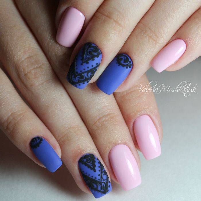 Как и во французском маникюре, в лунном белый полумесяц можно заменить кружевом, которое рисуется кистью, наносится с помощью стемпинг-трафаретов или вообще наклеивается. Главное чтобы у кружева сохранялась дугообразная форма.