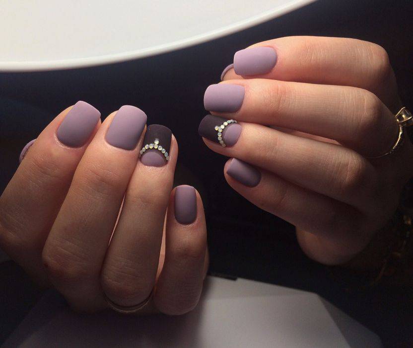 Не так давно в моду вошли матовые покрытия для ногтей. Лунный дизайн эта новинка не обошла стороной. Покрывать финиш-лаком с матовым эффектом можно как полукруг у основания ногтя, так и остальную его часть. Матовый лунный маникюр выигрышнее смотрится в темной цветовой гамме.