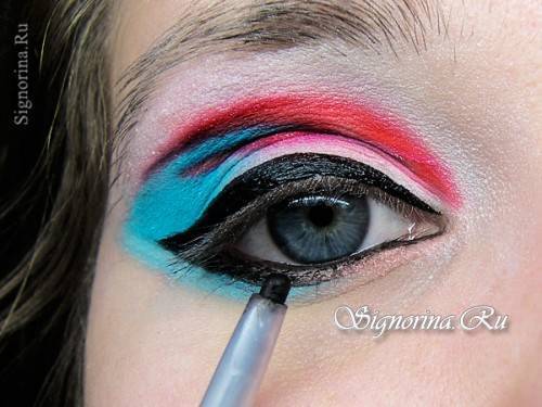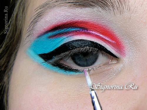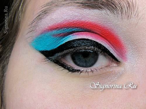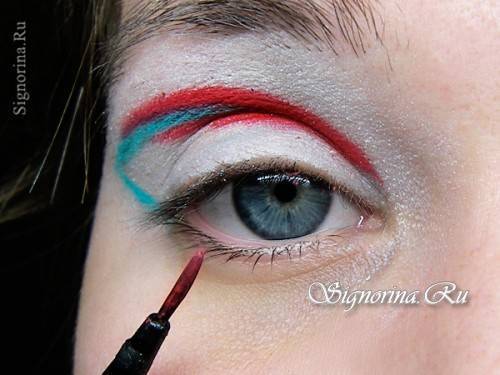 3. Добавим экспрессии: тонкой кистью прокрашиваем красными матовыми тенями линию над верхней голубой стрелкой и под ней. Дополнительно рисуем широкую черту на изгибе века. На фото чётко видно, что и как нужно делать.