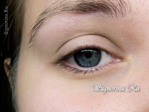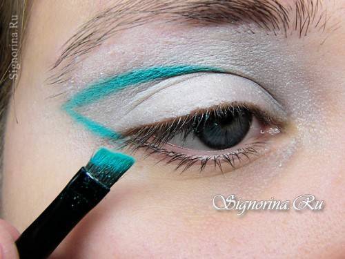 2. Наносим белую основу под тени на всё верхнее подвижное веко, включая и зону под бровью. Эта маленькая хитрость поможет теням накладываться равномернее и выглядеть ярче. Теперь берем маленькую скошенную кисть и ярко-бирюзовым цветом рисуем галочку-уголок, проводя линии: