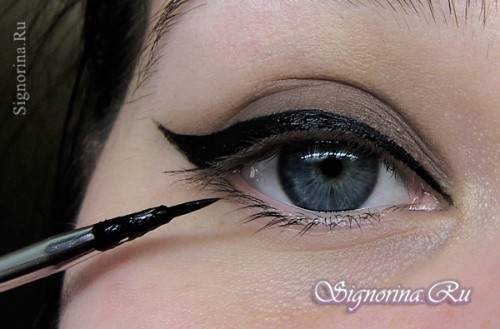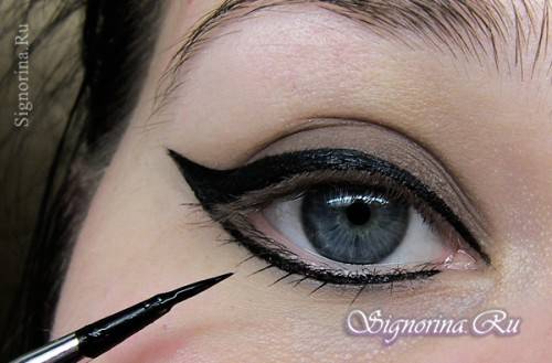 После нанесения теней, следует рисование стрелок. Для этого используется черная подводка или карандаш. Особенность рисования стрелок лежит в расширении их с середины глаза на верхнем веке, вздернутом конце, входящем за границу глаза. Нижнюю стрелку необходимо начинать, немного отступив от внутреннего уголка глаза, и смыкая ее с верхней в конце.