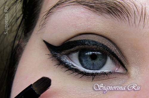 5. Следующий трюк призван максимально увеличить разрез глаз и сделать их бездонными. Прокрашиваем белым цветом образовавшийся пустой участок в зоне внешнего угла глаза. Пигмент наносим локально, чтобы не испортить уже готовую стрелку.