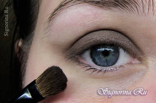 2. Для всех женщин элегантного возраста подходят матовые тени темно-коричневого цвета. Софи тоже большая поклонница этого натурального оттенка. Закрашиваем им все подвижное веко, но не выходим за линию изгиба. Во внешней зоне формируем пикантный уголок: слегка вытягиваем оттенок и выводим стрелочку за границу подвижного века, устремляя линию по направлению к краю брови.