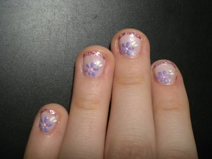 Пример несложного маникюра с цветочными нотками на детских ноготках