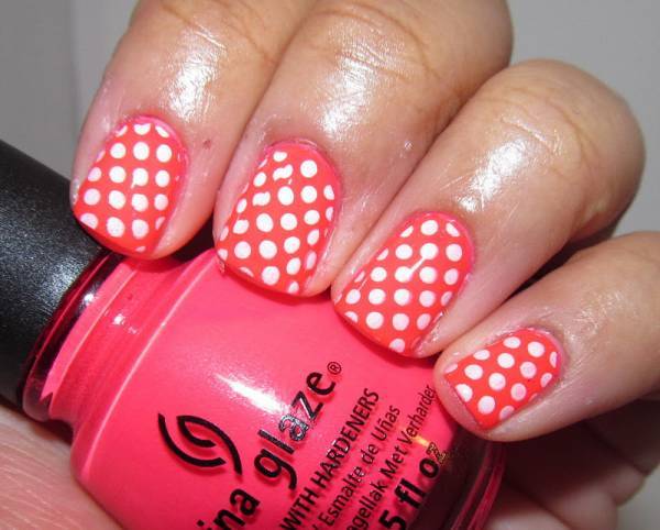 - Точечный рисунок. Всегда в тренде. На базовый цвет нанести ровные точки по всему ноготку. Чтобы точки были одинаковые можно использовать специальный инструмент – дотс. Для необычного дизайна, каждый ноготь можно покрасить разным цветом.