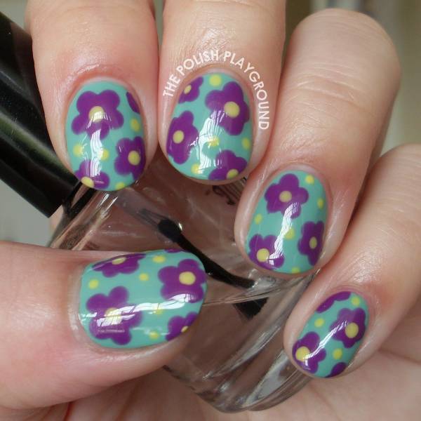 Цветочные мотивы. Нанесите на ноготок прозрачный лак. Поверх него любимым цветом проведите пару мазков. Это будут лепестки нашего цветка. Такой маникюр подойдет в школьное время.