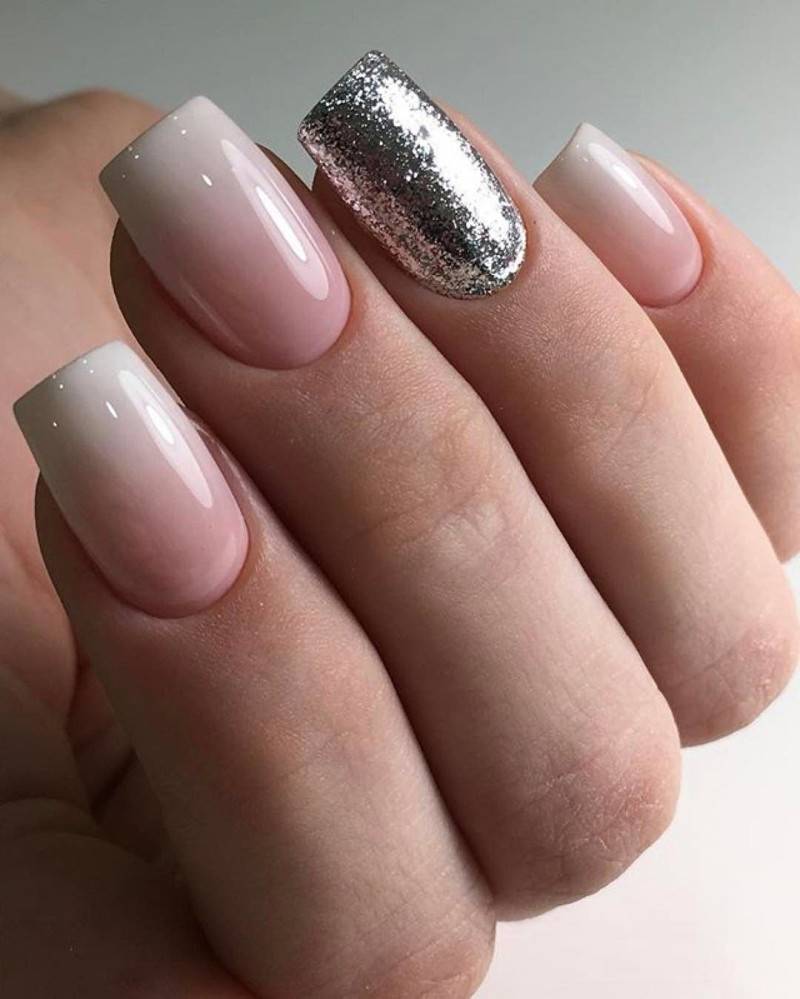 - Маникюр с блестками. Все гениальное просто и модно. Можно создавать эффект растяжки, нанося блестки, меняя интенсивность. Такое решение придает образу легкий налет гламура. Подобный нейл-арт требует чувства меры: лучше украсить блестками буквально один, максимум два пальчика, иначе образ будет смотреться вульгарно.