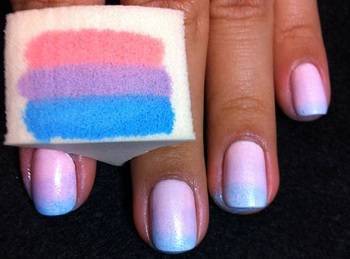 Этот вариант нанесения омбре не намного сложнее, чем первый, а выглядит интереснее. Если есть сомнения в собственных силах, можно предварительно нанести лаки в нужном порядке на палитру, фольгу или бумагу и аккуратно растушевать границы зубочисткой. А затем уже обмакнуть губку в лаки и отпечатать на ногте.