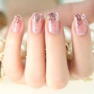 - Маникюр с блестками. Все гениальное просто и модно. Можно создавать эффект растяжки, нанося блестки, меняя интенсивность. Такое решение придает образу легкий налет гламура. Подобный нейл-арт требует чувства меры: лучше украсить блестками буквально один, максимум два пальчика, иначе образ будет смотреться вульгарно.