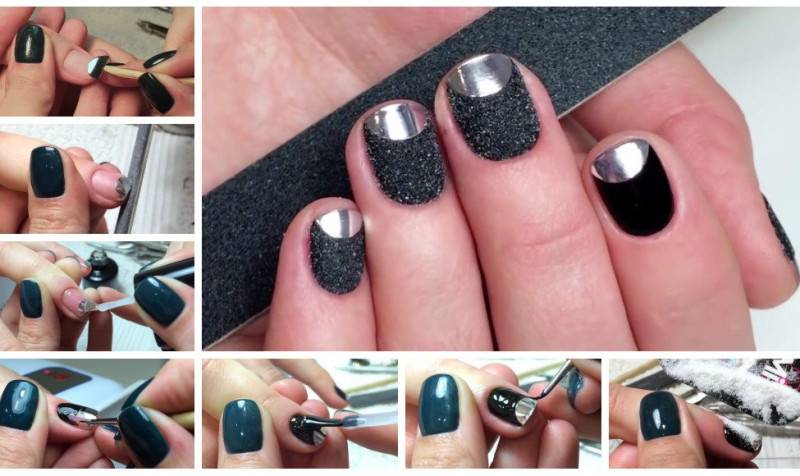 Второй метод дизайна ногтей песком пошагово отличается очередностью нанесения рисунка и бархатного песка