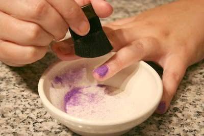 - После этого насыпают песок в небольшую емкость и окунают ноготь. Его как бы вдавливают в пудру