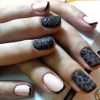- Затем участок ногтя, который не закрыт пленкой заполняется черным гель-лаком.