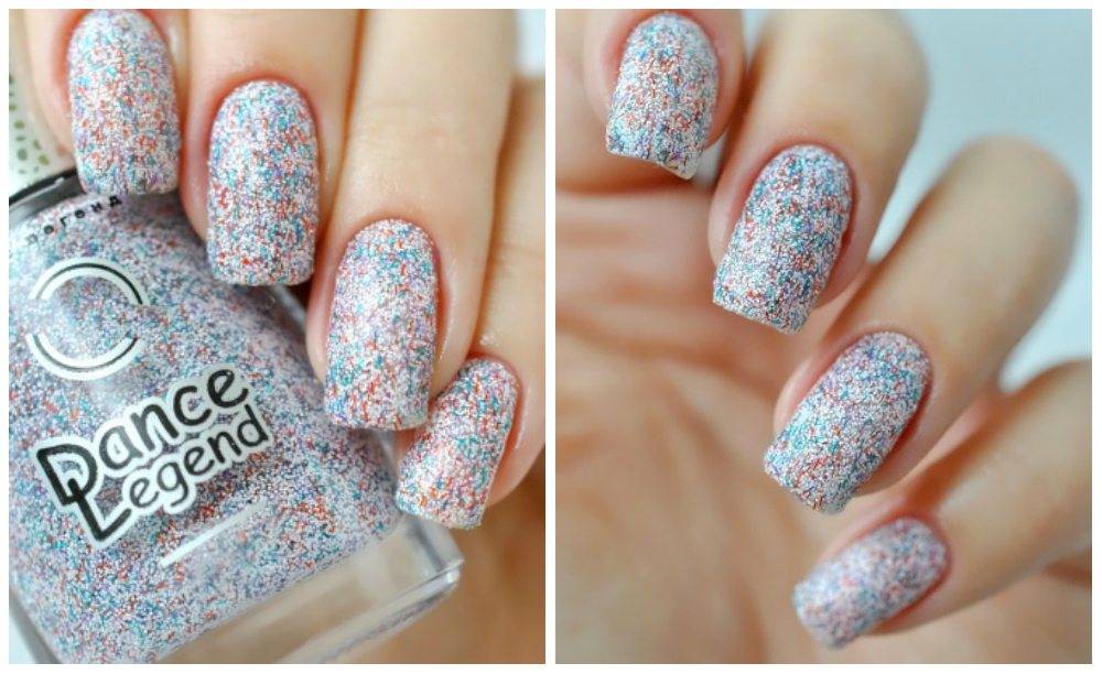 Кстати, если вы хотите добиться подобного «песочного» эффекта на всей поверхности ноготков, можно воспользоваться упрощенным способом и приобрести глиттерные лаки, например, Dance Legend. Его нанесение в 2 слоя создает плотное покрытие и в отличие от глиттера поверх лака, блестки не будут осыпаться.