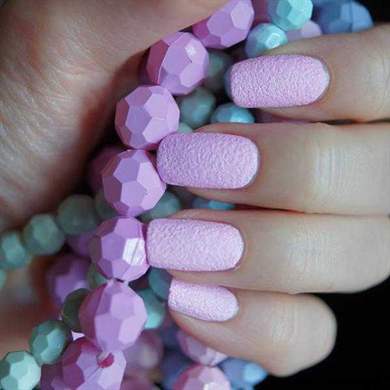 Таким образом, обеспечивается стойкость покрытия на длительный период. Цветовая палитра этого материала разнообразна. Еще одной особенность является то, что благодаря полупрозрачности акриловой пыли, ее оттенок можно корректировать выбранным цветом основного покрытия. Бархатный песок используется для дизайна как натуральных, так и нарощенных ногтей.