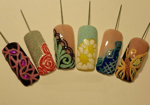 4. Достав ноготь из лампы, с него стряхивается весь лишний песок с помощью жесткой щеточки. При правильном выполнении всех инструкций он должен остаться только на рисунке гель-краской. В итоге на ноготках создается красивый рельефный и объемный дизайн.