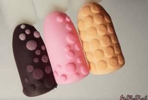 Эффект объема достигается в том случае, если основа имеет густую консистенцию, характерную для гелей. Если же песок наносить на ногти, покрытые обычным жидким лаком, эффекта не будет.
