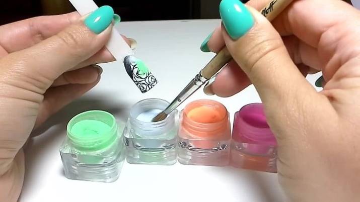 - Берется тонкая кисть и с ее помощью создается узор гель-краской. Для этой цели можно применять и гель, но его текстурная особенность не позволит прорисовать очень тонкие линии.