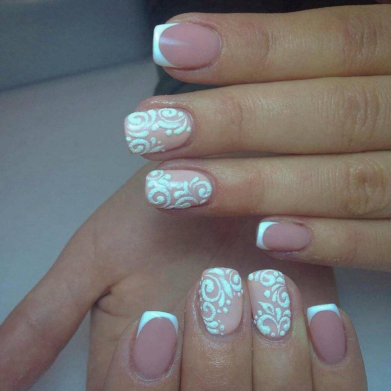 - Приступаем к рисунку. Для этого может быть использован белый гель-лак или гель-краска. Для нанесения узора вам потребуется тонкая кисть. Прорисовывайте завитки вокруг каждого страза, чтобы получилась розочка. Лепестки могут быть разного размера и толщины, не стоит стараться сделать все три розы одинаковыми, каждая из них должна получиться индивидуальной.