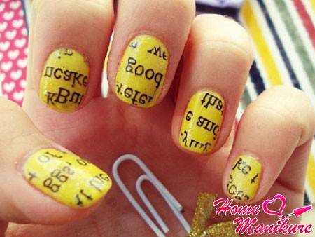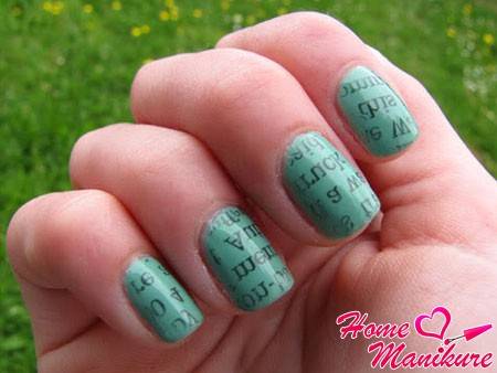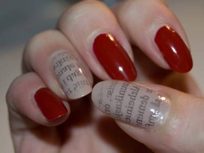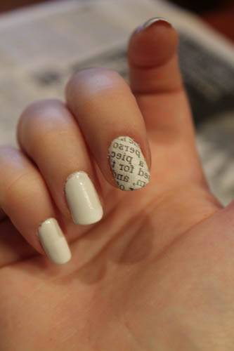 Можно также декорировать ногти еще одним оригинальным способом. Для этого на подготовленную ногтевую пластину наносится основа, которая покрывается лаком светлого оттенка. Когда все как следует высохнет, смочите ноготки водой и приложите к ним кусочки газет или вырезанные полоски текста. Затем можно покрывать все несколькими слоями закрепителя, которые надежно зафиксируют бумагу и придадут маникюру красивый блеск.