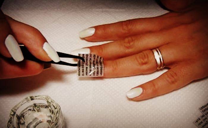 - Снимают прямоугольник и проделывают то же самое с другими ногтями.Текст газеты хорошо отпечатывается на ногте