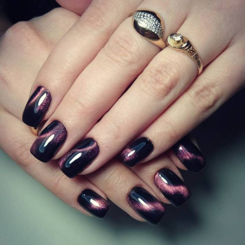 Если учитывать частоту использования темных оттенков на ноготках отечественных и зарубежных знаменитостей, то их нахождение в тренде становится очевидным. А присутствие в маникюре «кошачьего» перелива только подчеркнет намерения модницы выглядеть по всем требованиям тренда.