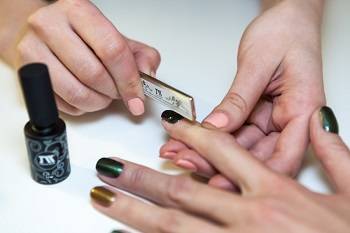 При использовании черной основы, нанесение лака осуществляется в два слоя. Первый слой выполняется стандартно и сушится в течение двух минут, а нанесение покрытия во второй слой выполняется по отдельности с каждым пальцем.