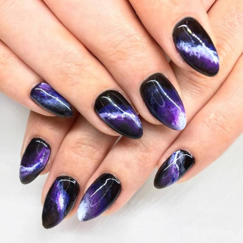 - Обычные гель-лаки, которые бывают разных оттенков, но дают эффект звездного неба с одной более светлой полосой. Они держатся не дольше недели и снимаются размачиванием.
