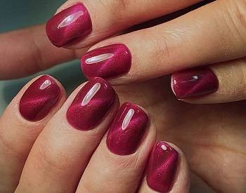 - Элегантное и модное бордовое «кошачье» покрытие для ноготков смотрится роскошно и стильно. Удачный выбор — матовый однотонный маникюр. Возможно воплощение разных идей дизайна бордовых ногтей: от росписи до сложных аппликаций.