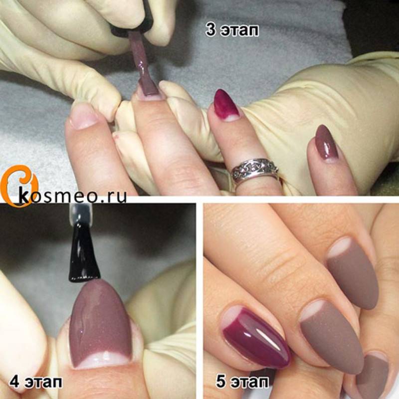 Такой способ требует определённого навыка и сразу может не получиться. Использования акрила. Ноготь красится привычным способом до финишного покрытия. На непросушенный топ нужно насыпать акриловую пудру с бархатным эффектом и отправить ноготь в лампу. После просушки следует смахнуть остатки акрила кистью. Матовая пыль. Пыль бывает разных цветов, поэтому после нанесения слоя базы можно переходить к нанесению топа. На непросушенный топ, как и в случае с акрилом, нужно насыпать пыль выбранного цвета. Просушив в лампе, следует убрать излишки пыли кистью. Можно использовать матовое покрытие для обычного лака. Оно наносится после всех этапов с гель-лаком на глянцевый топ